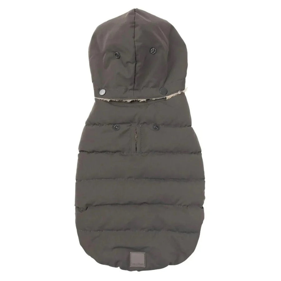 The Essential Puffer Dog Jacket in Charcoal is a must-have for your pet’s wardrobe. With a stretchy underside, it's perfect for dogs who need a little extra room around the chest or have mobility issues. The snap buttons on the neck and chest make it easy to put on—just have your pet step into the leg holes and wrap the jacket around their back. The hood can be held back with snap buttons or removed completely. There's also a harness hole for easy lead access.