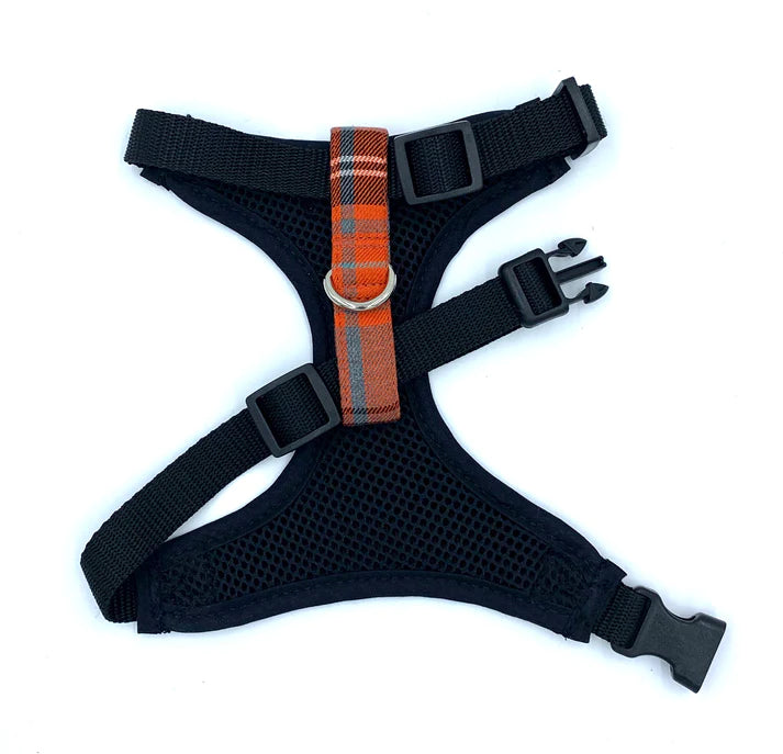 Barkley & Fetch - Beautiful orange/grey tartan fabric and padded mesh harness with adjustable straps. comfy and durable.